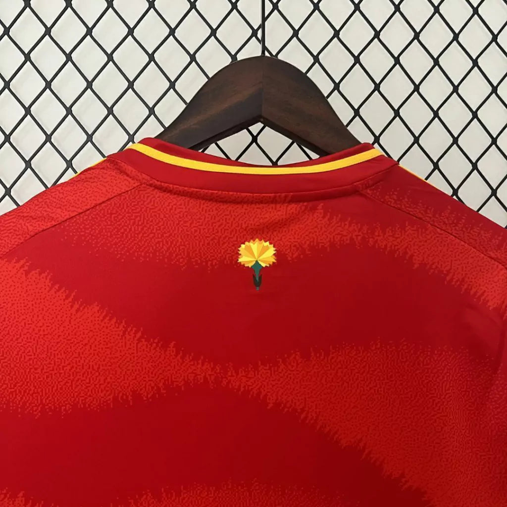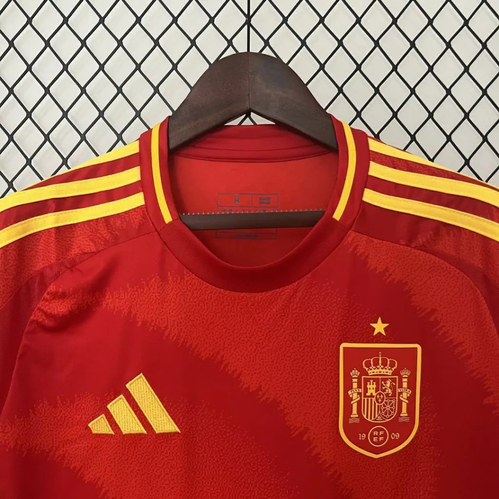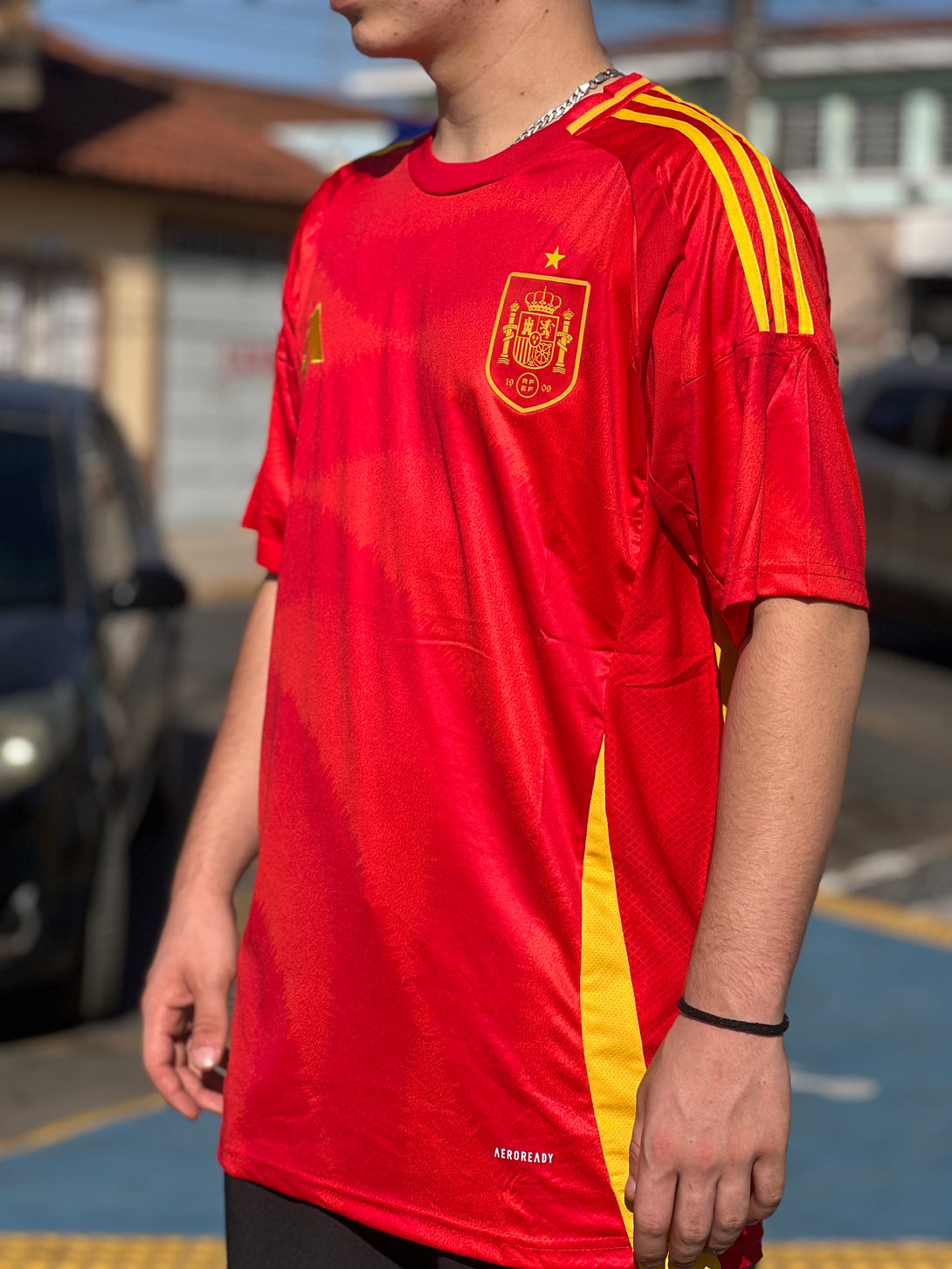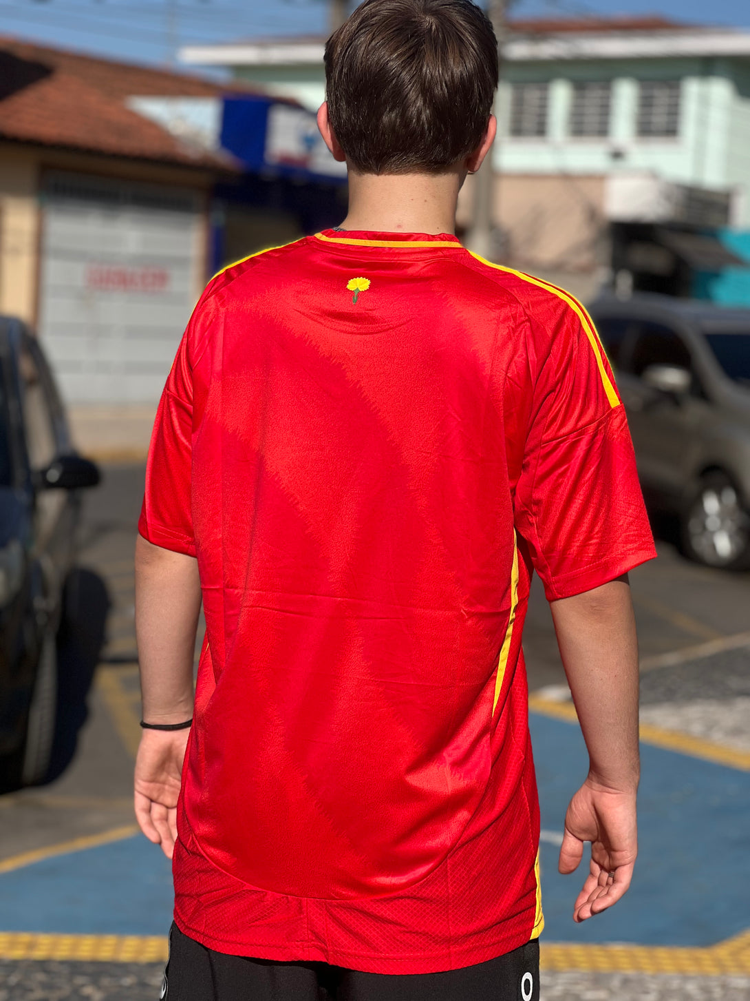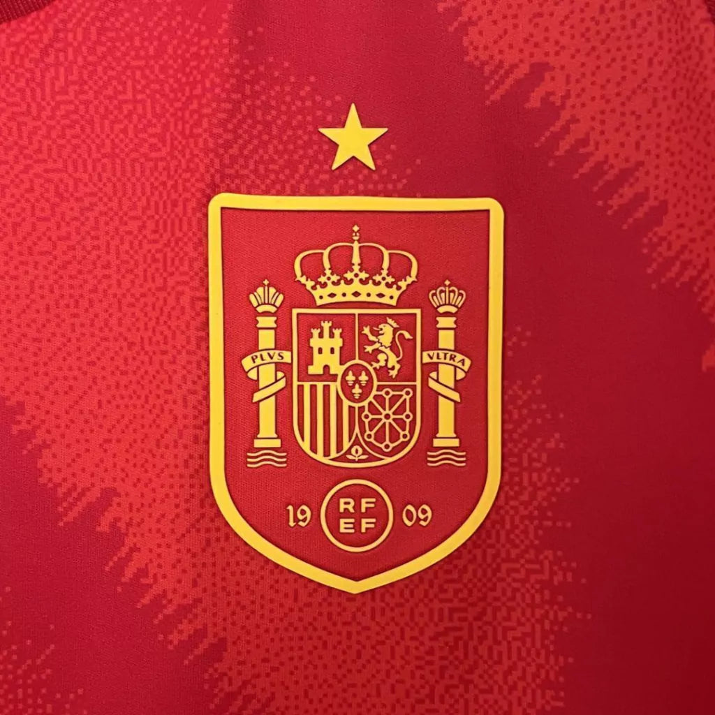 A Camisa da Espanha 24/25 chega para honrar a tradição de uma das seleções mais vitoriosas do futebol mundial. O modelo mantém o clássico vermelho vibrante, símbolo da paixão espanhola, e ganha detalhes em amarelo dourado que reforçam a identidade marcante do time. O escudo bordado no peito, junto da estrela dourada que celebra o título mundial, transmite história, orgulho e pertencimento.
