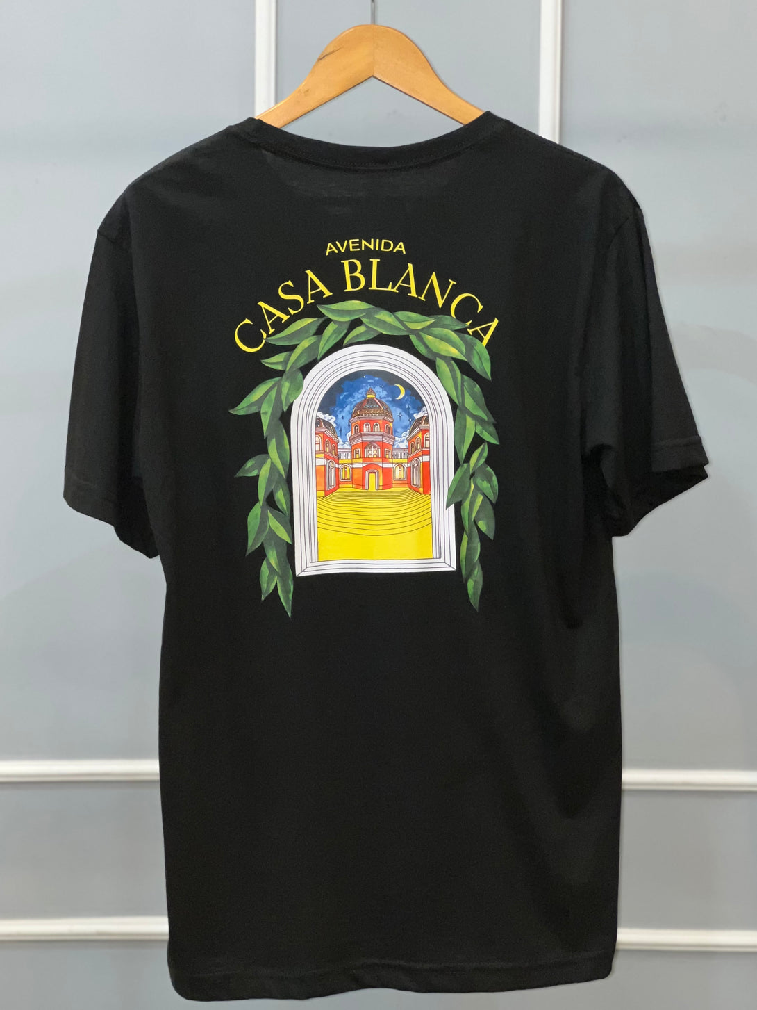 A Camiseta Casa Blanca combina arte, cultura e moda em uma única peça. A estampa nas costas é um convite para atravessar uma janela imaginária e encontrar um cenário vibrante, com um céu estrelado e construções clássicas iluminadas.