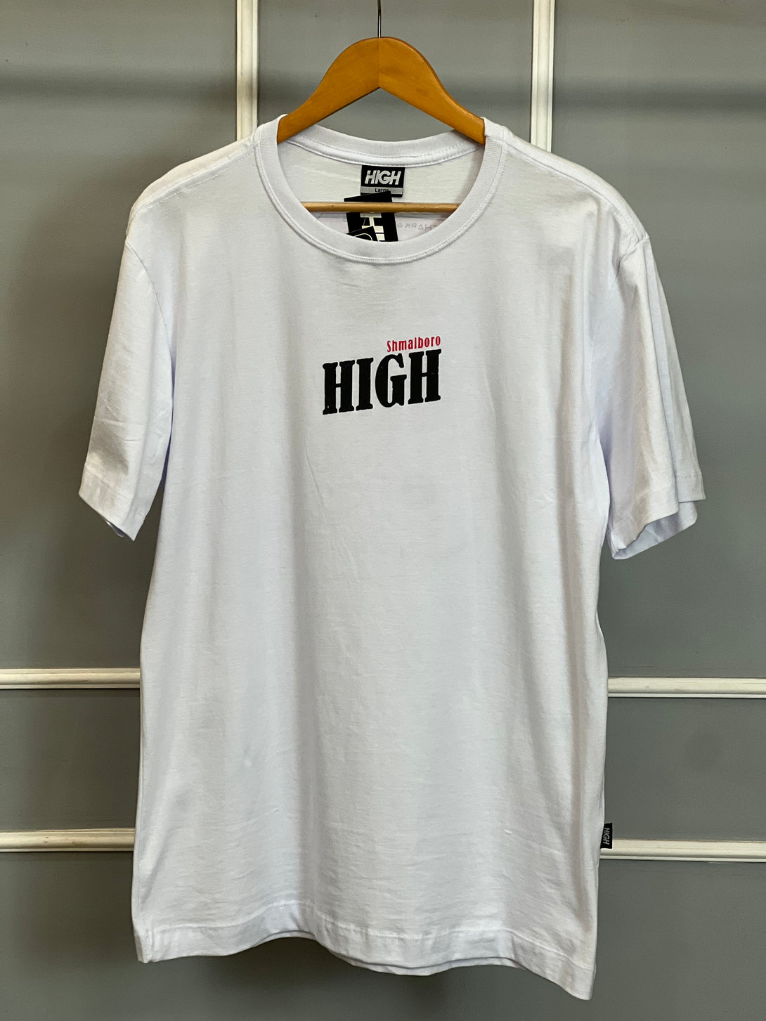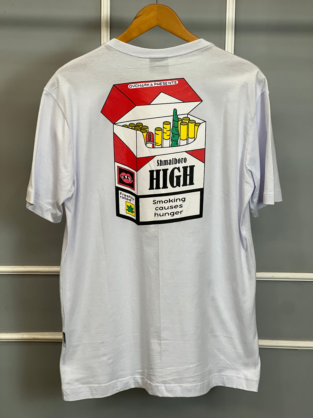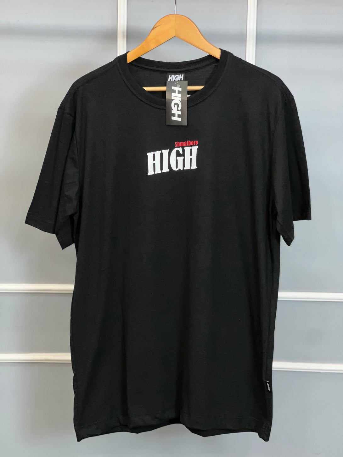 A Camiseta Shmalboro High traz uma estampa gráfica ousada nas costas em formato de caixa de cigarros estilizada, carregando um toque criativo e cheio de personalidade. Feita em algodão premium, oferece conforto e durabilidade, perfeita para quem busca um visual autêntico no streetwear.