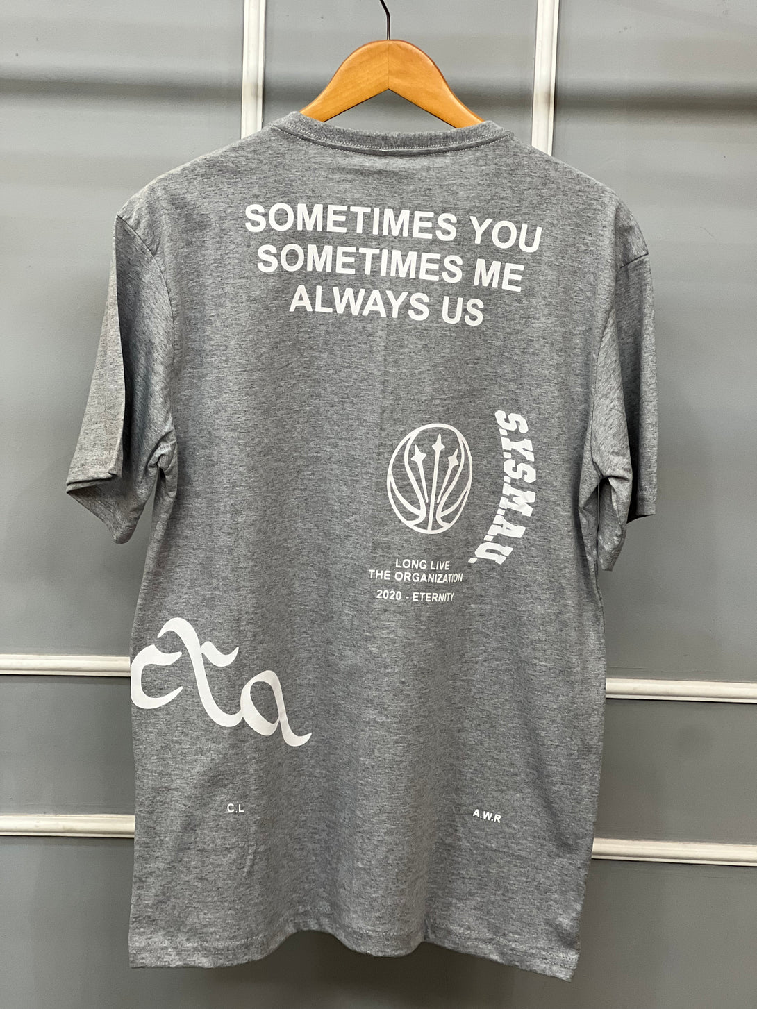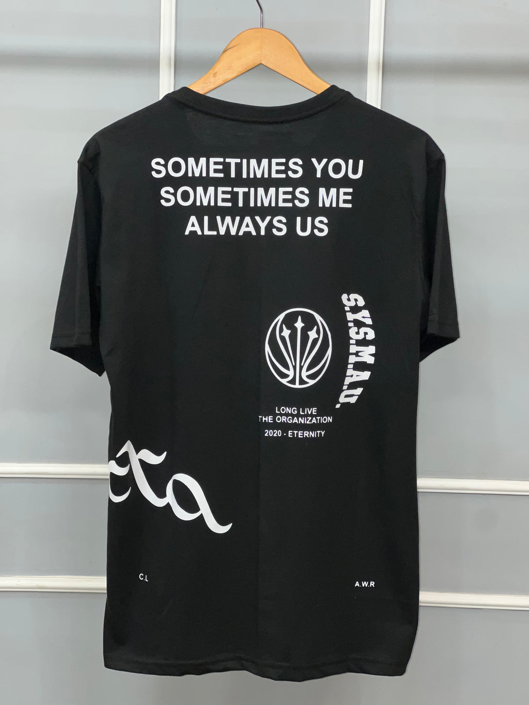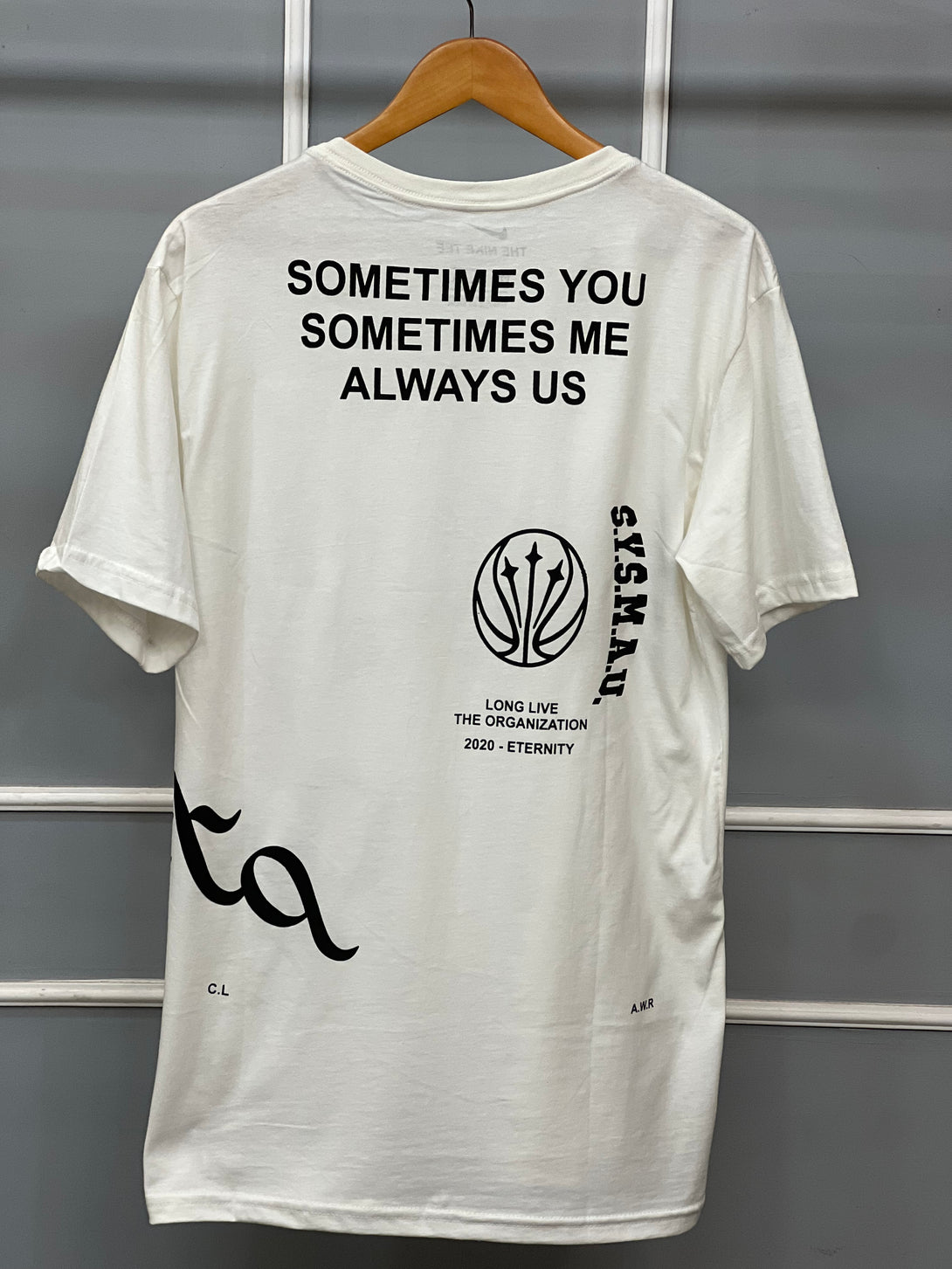 Na parte frontal, o destaque vai para o logo NOCTA em tipografia marcante, acompanhado do icônico Swoosh da Nike. Já nas costas, a frase “Sometimes You, Sometimes Me, Always Us” reforça a essência coletiva e a visão única da coleção.