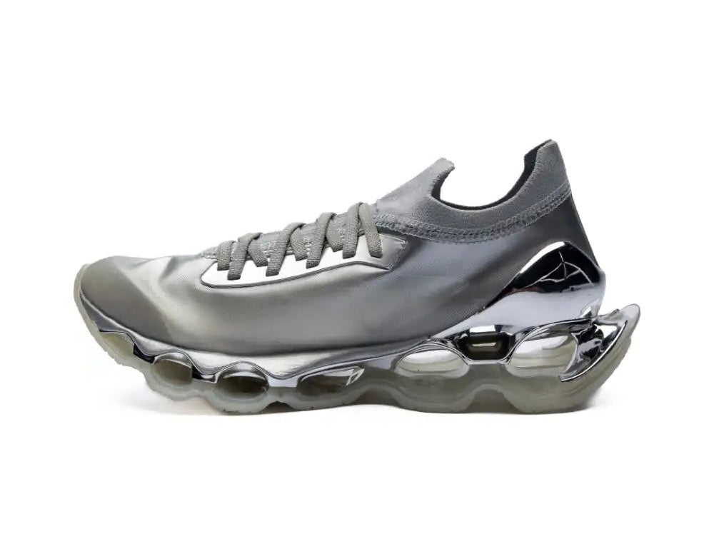Inspirado em suas esculturas metálicas e robôs hiper-realistas, o Wave Prophecy Sorayama traz uma estética cromada e translúcida, com design que reflete luz e movimento em cada passo.