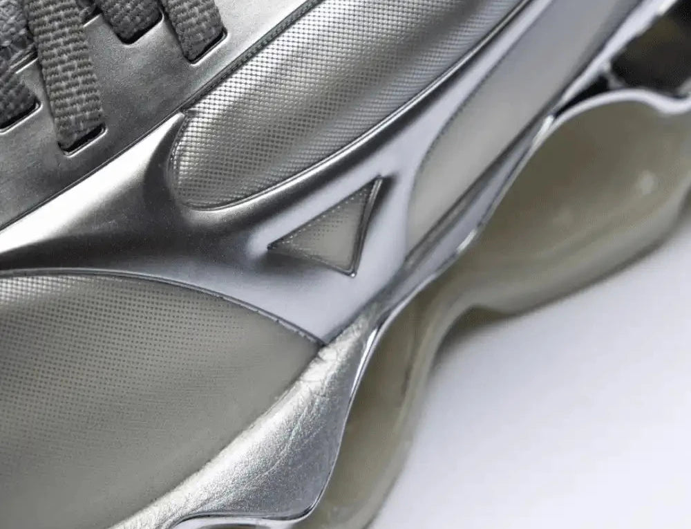 Design: cabedal metálico com acabamento espelhado e detalhes translúcidos que criam uma aparência futurista e ousada.