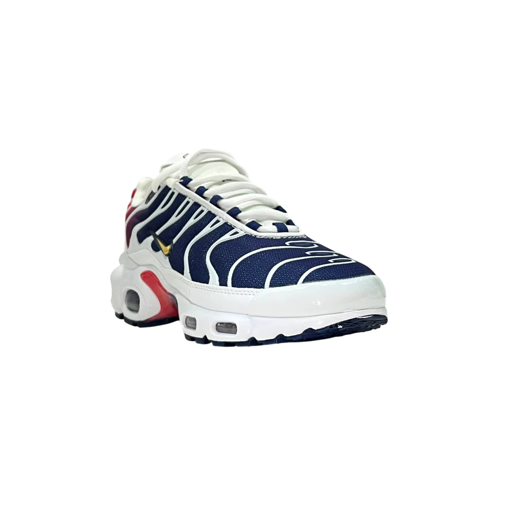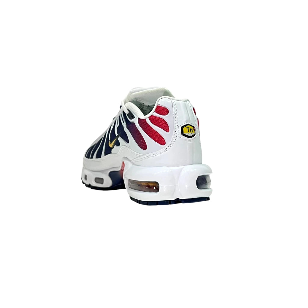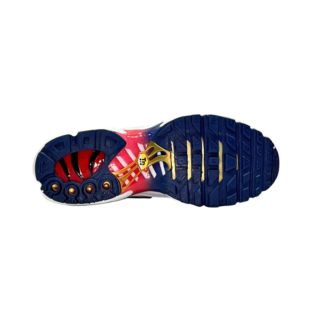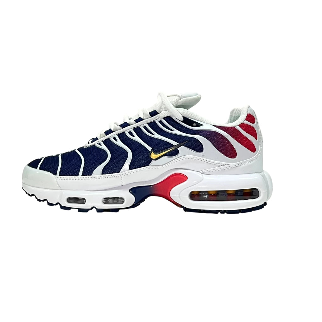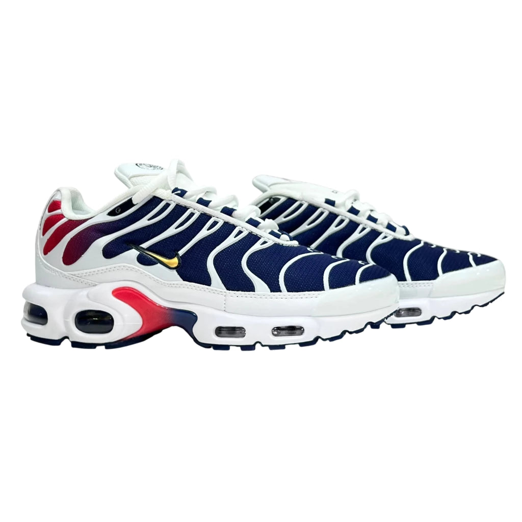 O Air Max TN Plus 1 “PSG Importado” traz toda a identidade marcante da linha Tuned Air com um design que une estilo urbano, conforto e exclusividade. Inspirado no Paris Saint-Germain, o modelo combina cores que remetem ao clube francês: azul marinho, branco, vermelho e detalhes dourados, entregando um visual sofisticado e esportivo ao mesmo tempo.